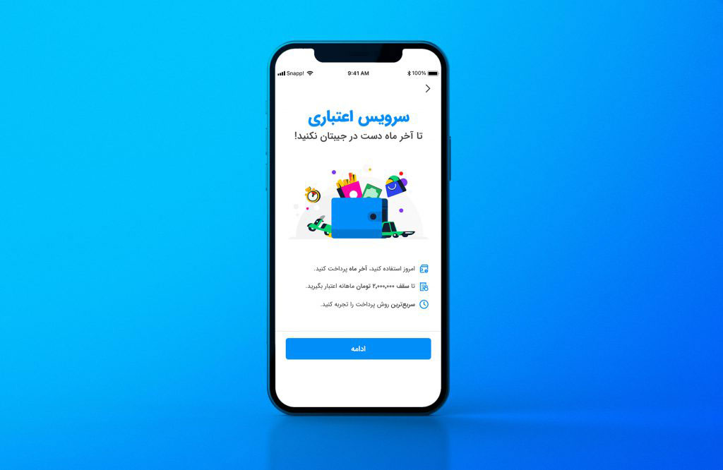 پس از انتخاب گزینه سرویس اعتباری وارد صفحه اصلی این خدمت میشوید. در این بخش اطلاعات کوتاهی در مورد قابلیتهای سرویس ارائه شده است. گزینه ادامه را بزنید تا وارد صفحه جدیدی شوید.