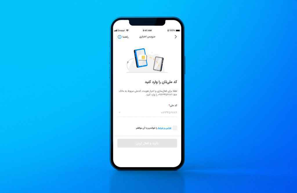 پس از لمس دکمه ادامه وارد صفحه بعدی میشوید. در این صفحه باید کد ملی خود را وارد کرده و سپس گزینه «قوانین و شرایط را مطالعه کرده و با آن موافقم» را انتخاب کنید. پس از درج کد ملی و انتخاب گزینه مطالعه قوانین، دکمه «فعالسازی» به رنگ آبی در خواهد آمد.